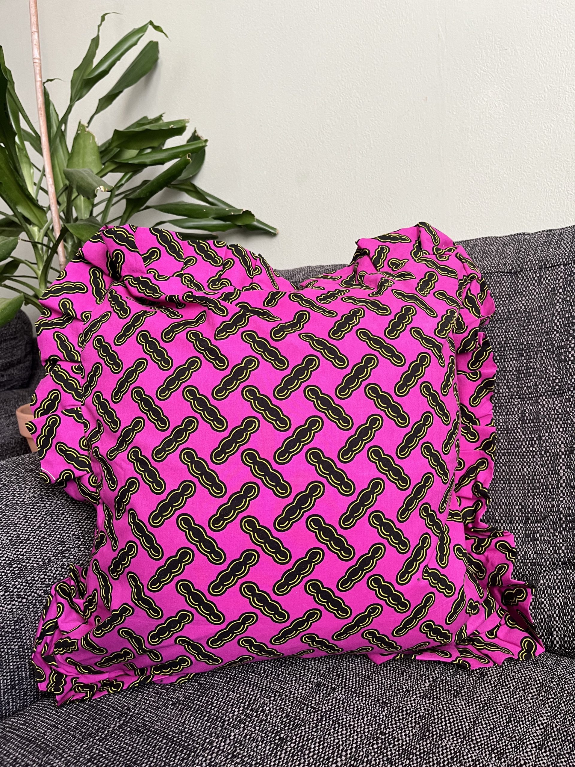 Each cushion cover is handmade with love using authentic African wax print cotton, finished with a ruffled edge that adds soft texture and movement. Whether styled solo on a statement chair or mixed into your favourite cushion stack, Dira transforms any space into one that feels intentional and alive.