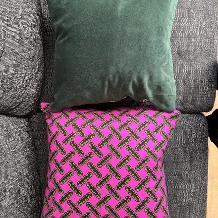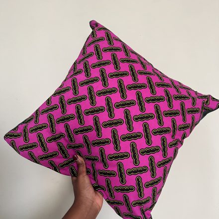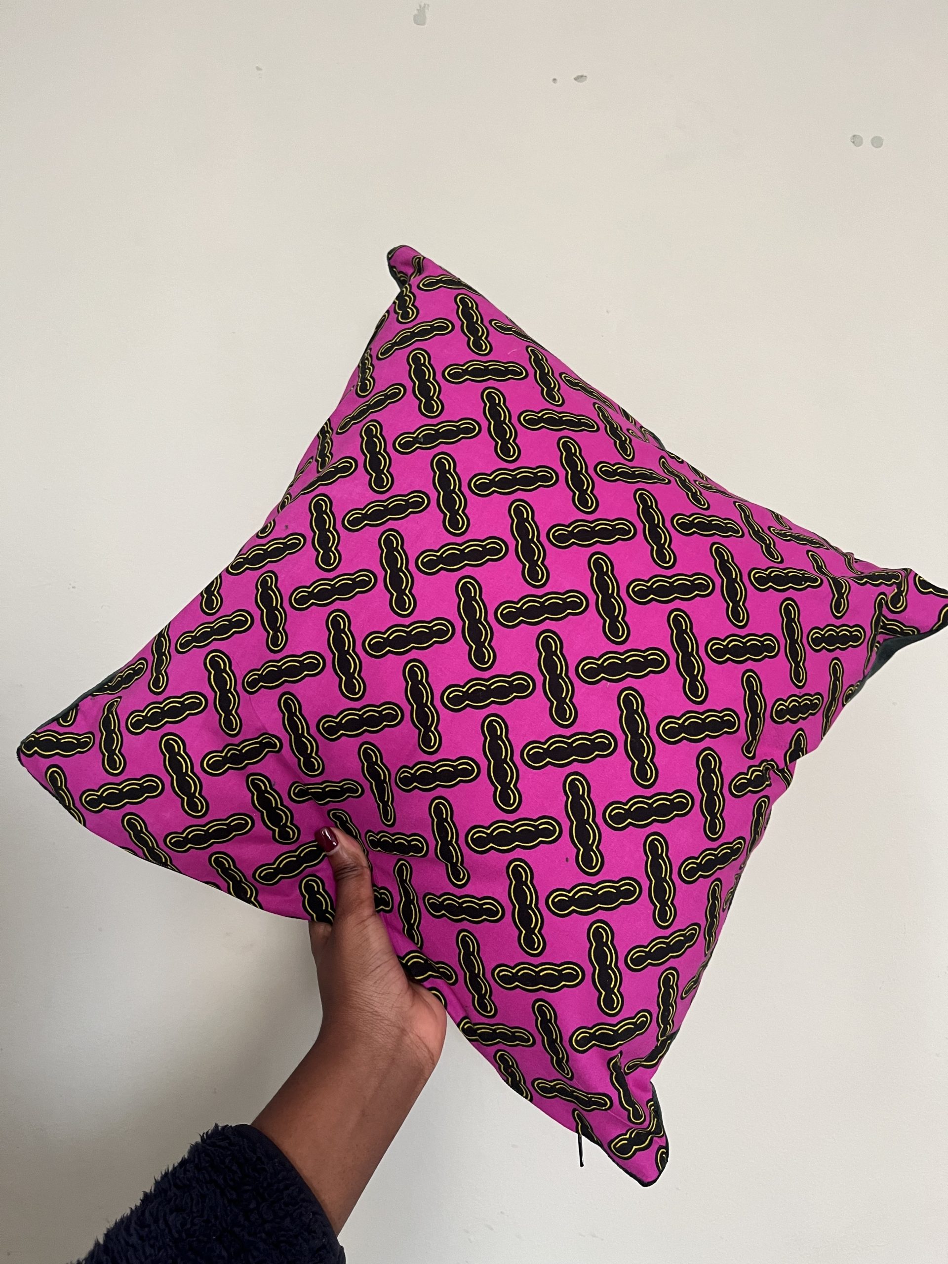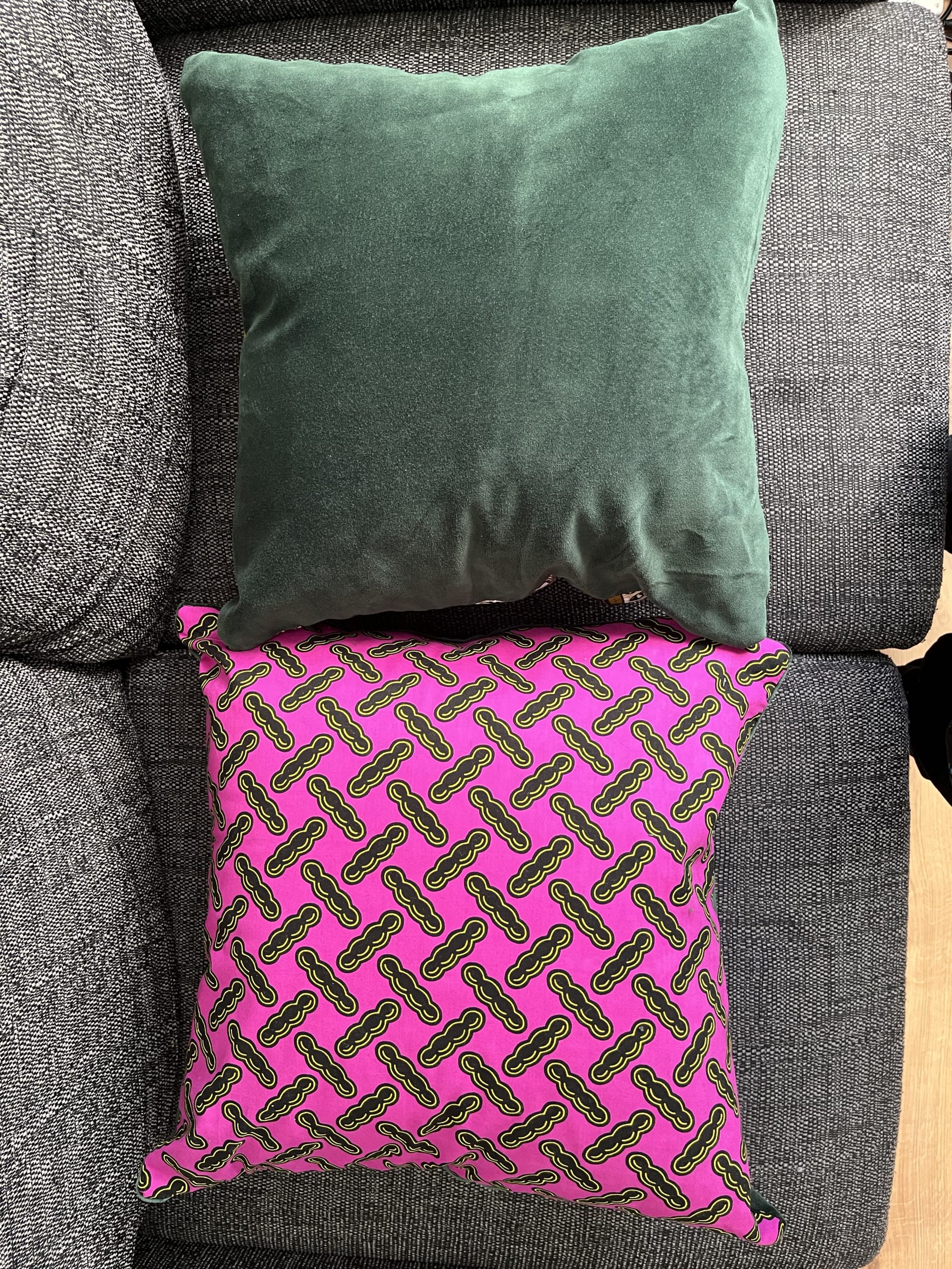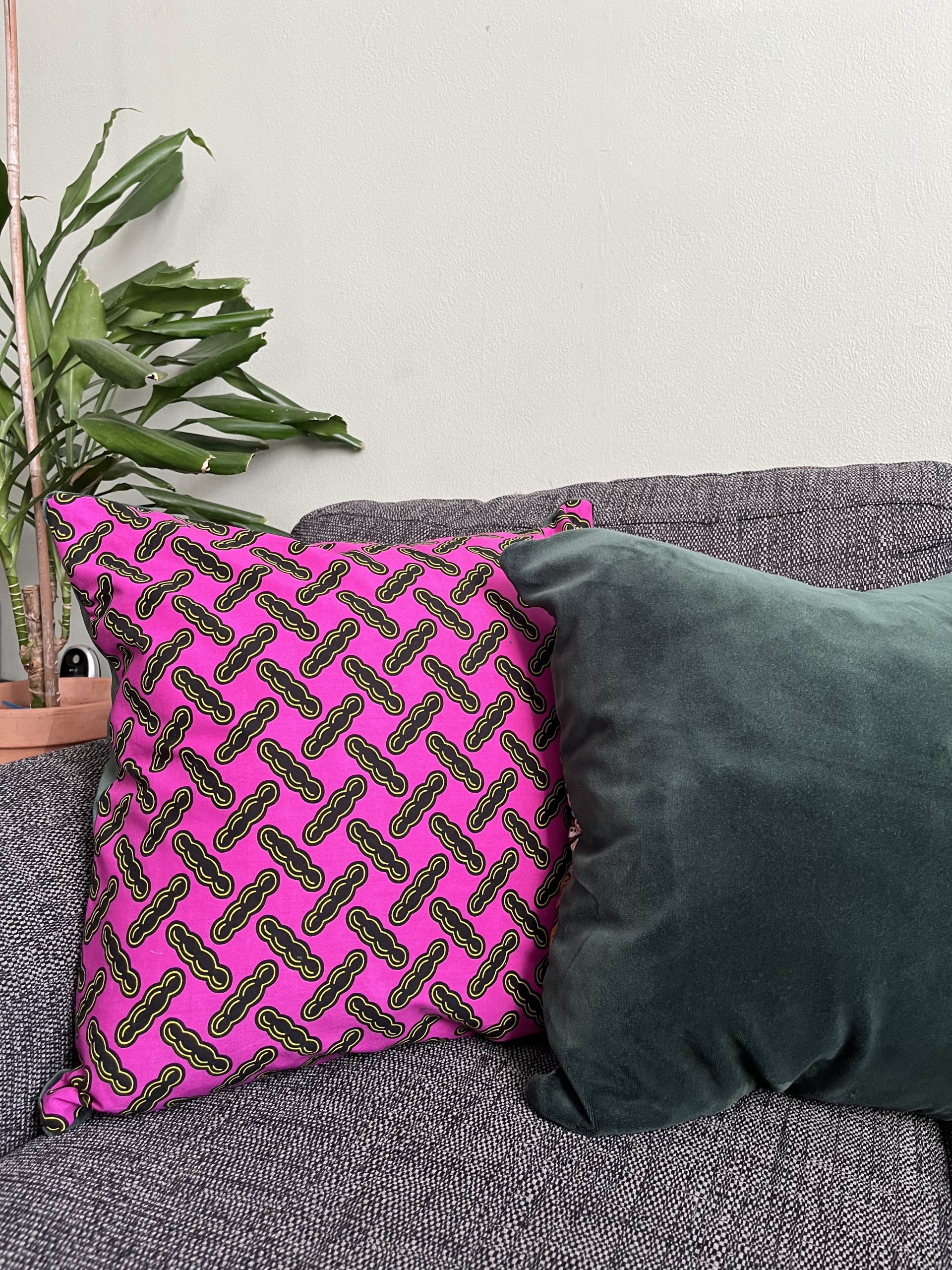 Transform your space with the Dira Reversible Cushion. Handmade in London, the front showcases a vibrant pink African print, while the reverse is crafted from luxurious forest-green velvet — giving you two stylish looks in one cushion.